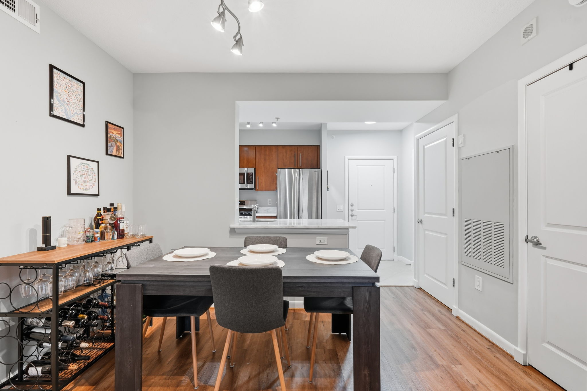The kitchen is a showstopper. White marble countertops complement wood cabinetry, creating a clean, timeless aesthetic. Whether you’re preparing a quiet weeknight dinner or hosting friends before heading out in Clarendon, this kitchen delivers both style and function.