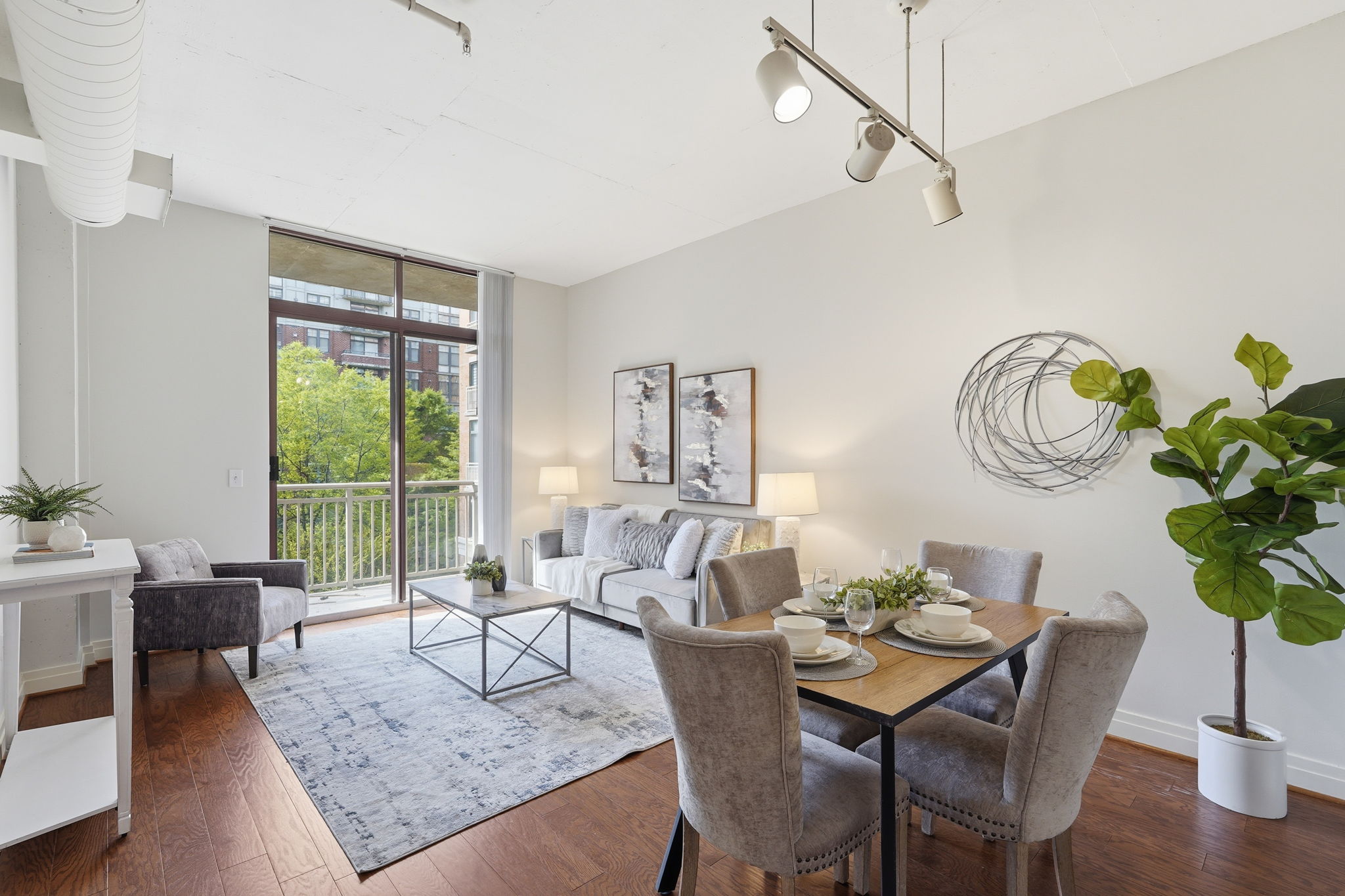 Inside, soaring 11-foot ceilings, exposed ductwork, and clean architectural lines create the signature loft aesthetic, while abundant natural light pours in through oversized windows and glass doors. Warm hardwood floors run throughout the main living area, adding richness and contrast to the light, neutral palette.